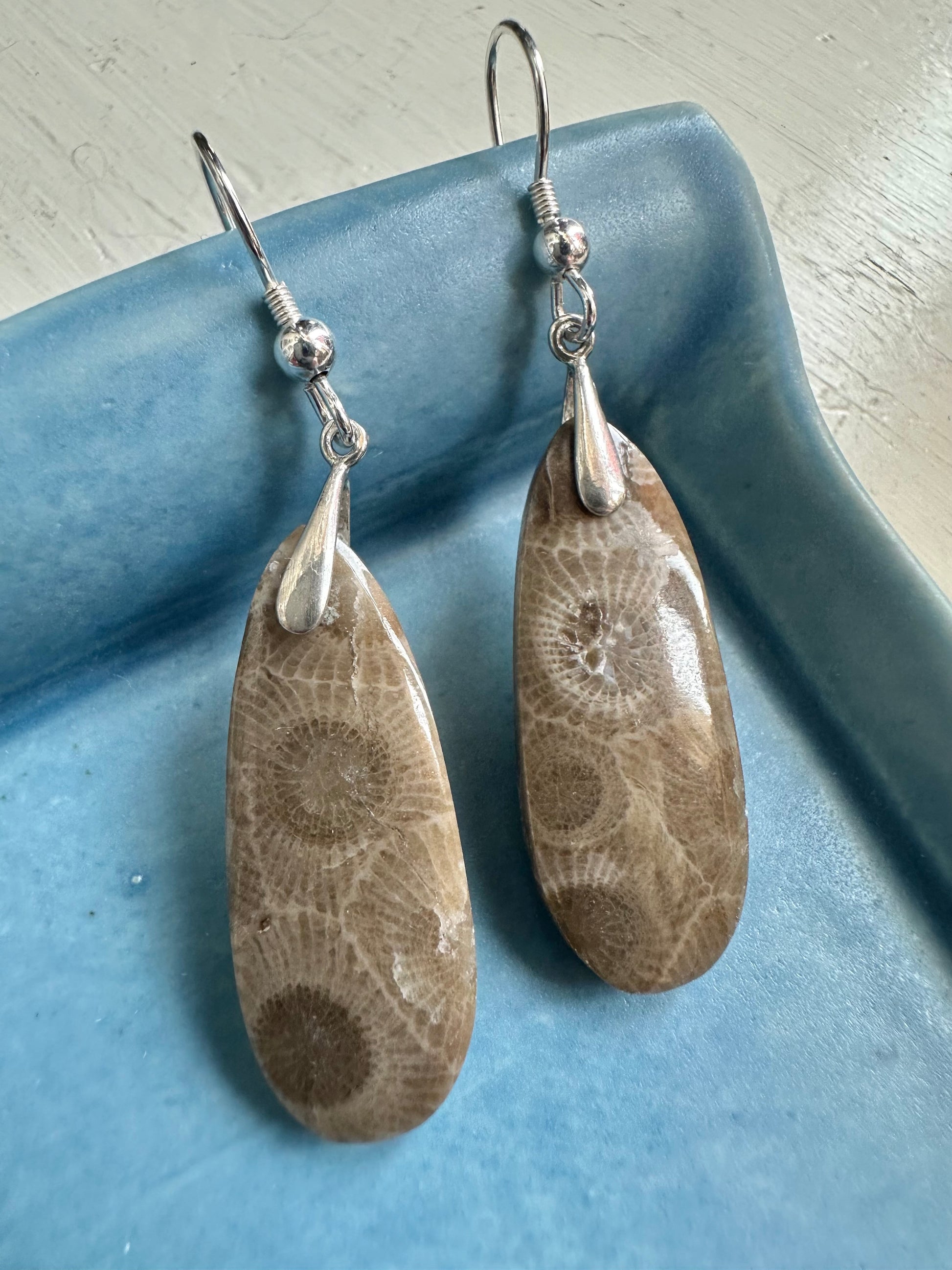 These Petoskey Stone tear drop earrings are one-of-a-kind with sterling hooks.