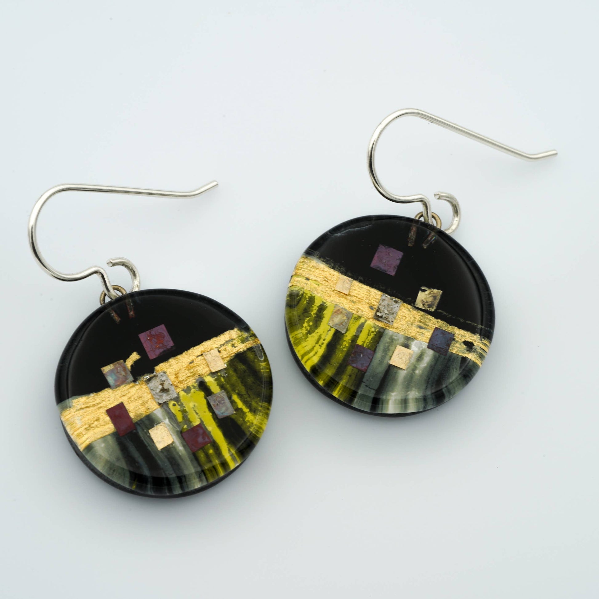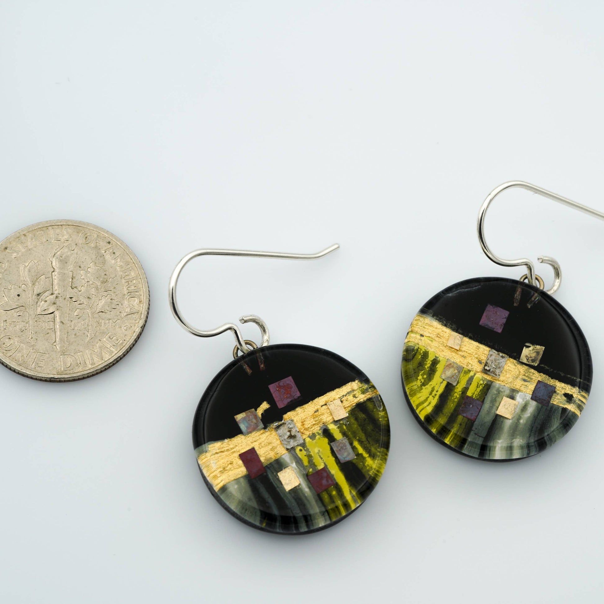 Part of the GOLDEN PHASE collection, loosely referring to a period of work in Gustav Klimt's career of the same name. The ear wires are argentium silver (nickel-free, slow tarnish) and come with silicone ear backs included. (please note that slight variations from the photographed item are inevitable due to the nature of this work -- each design is hand-painted onto the glass)