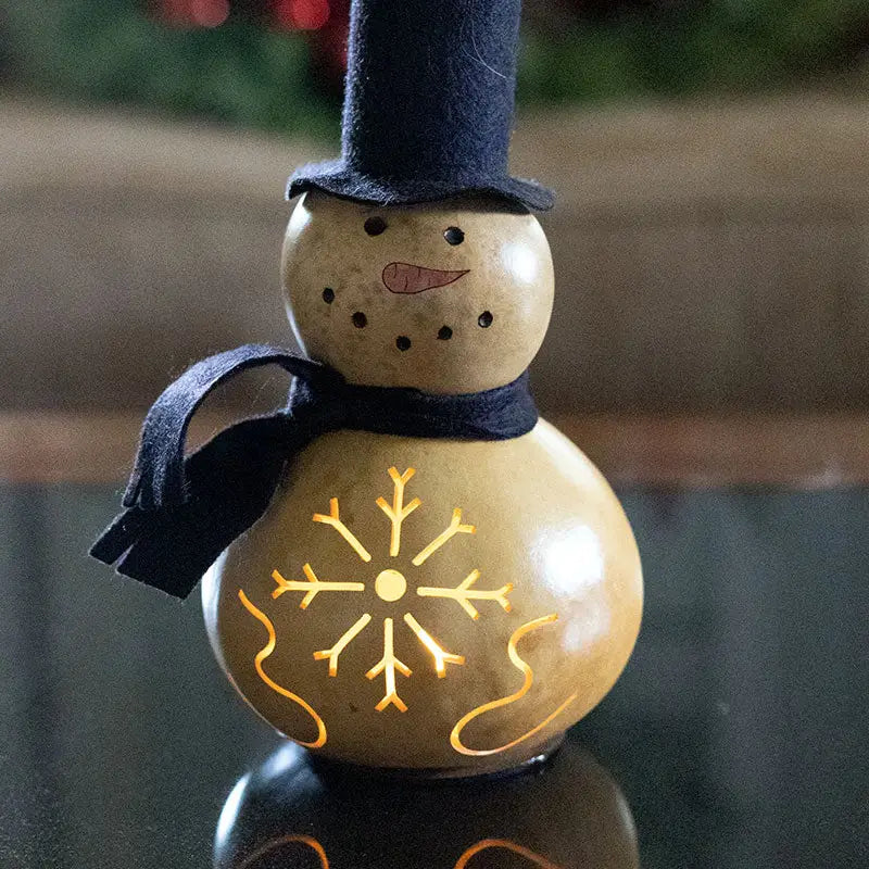 Charlie is our natural colored snowman with a cute classic snowman face. He has a handcrafted snowflake along with mittens. Can be lit by purchasing a battery-operated tea light.