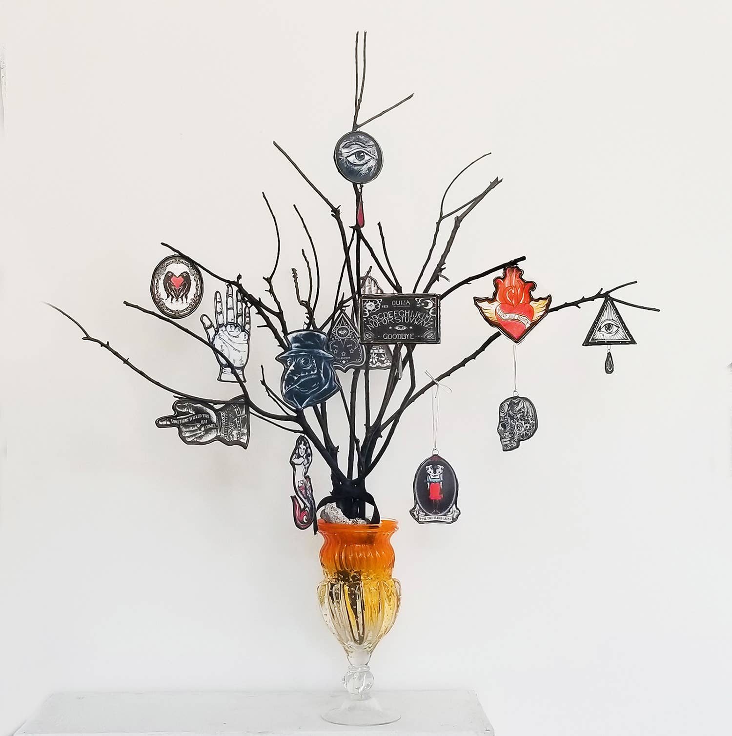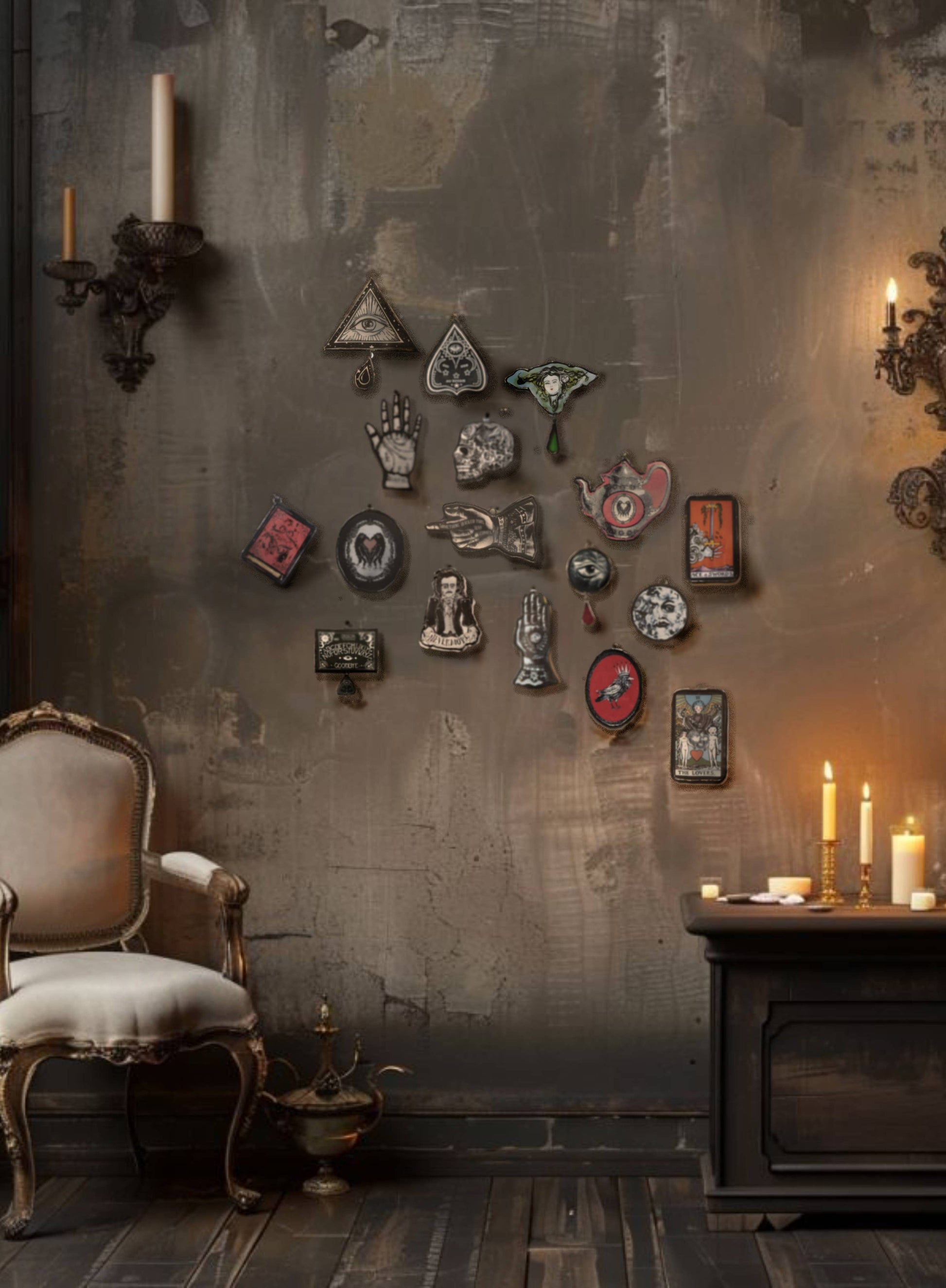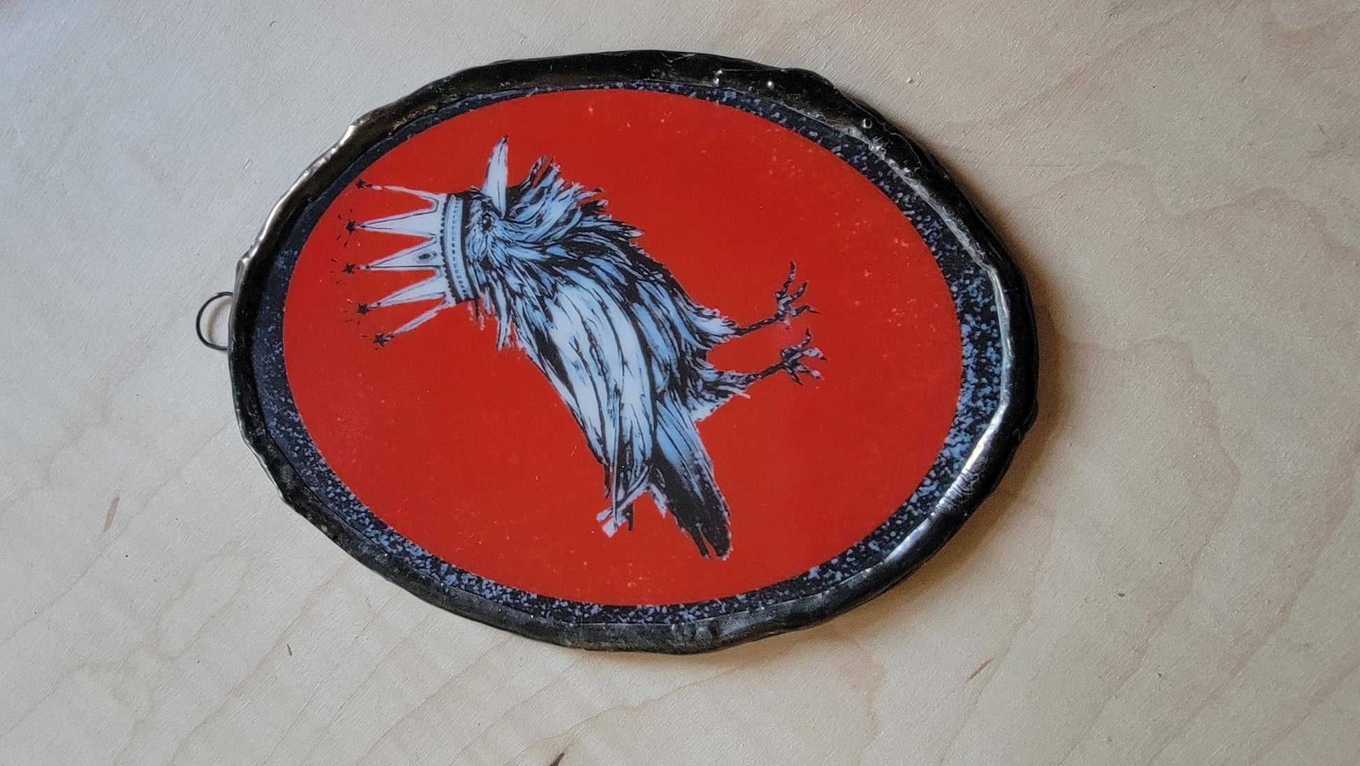This is the King of Crows, an original illustration hand-enameled onto translucent white glass, finished in a pewter edge with hanger. Perfect for wall or window! 3.5 x 2.