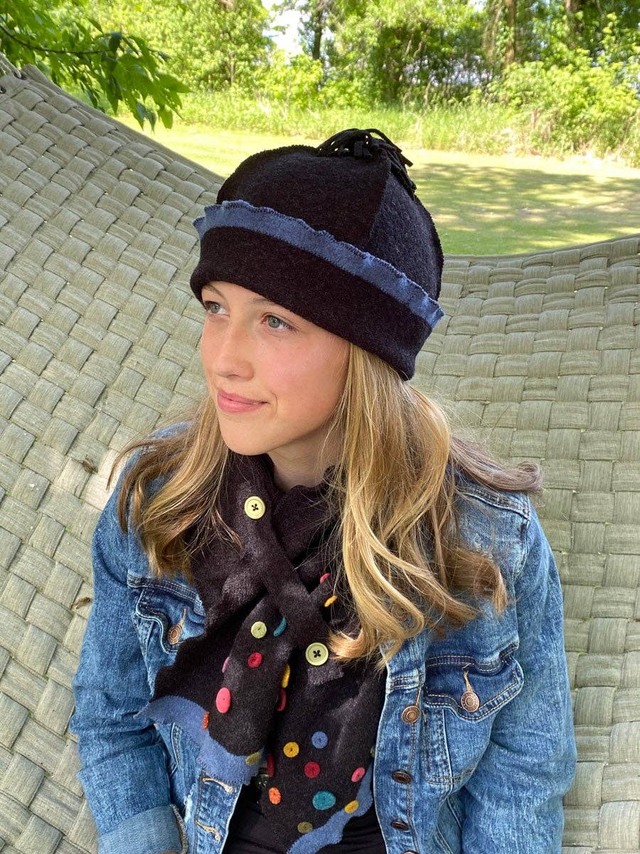 Embellished wrap in 100% wool. Black with colorful dot embellishments. 38-40 x 8 inches in size.