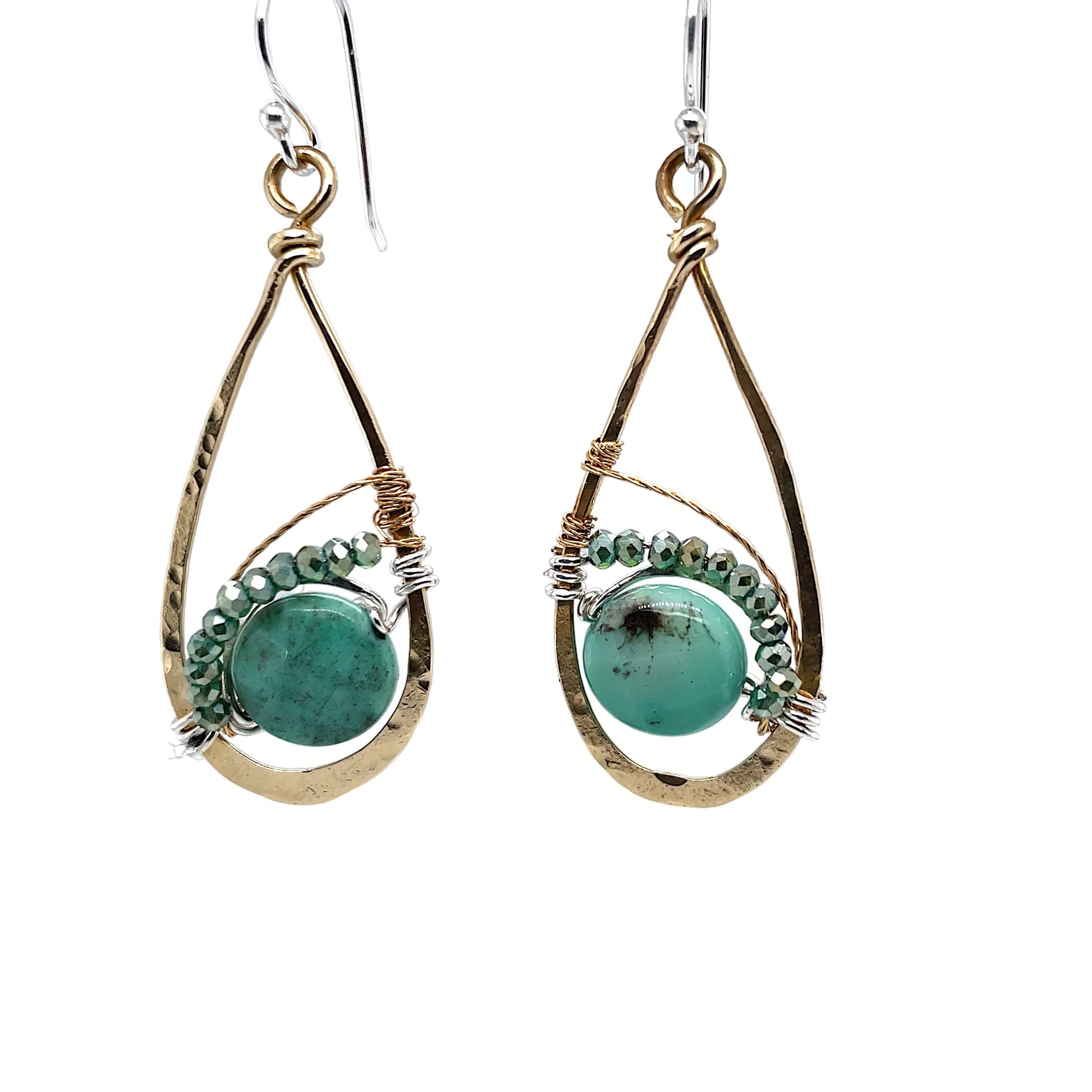 Dark chrysoprase faceted coin gemstones artistically held in sterling silver to our own hand formed shiny brass drops with metallic crystal accents earrings. Colorful and earthy but with a bunch of shimmer and glitter.
