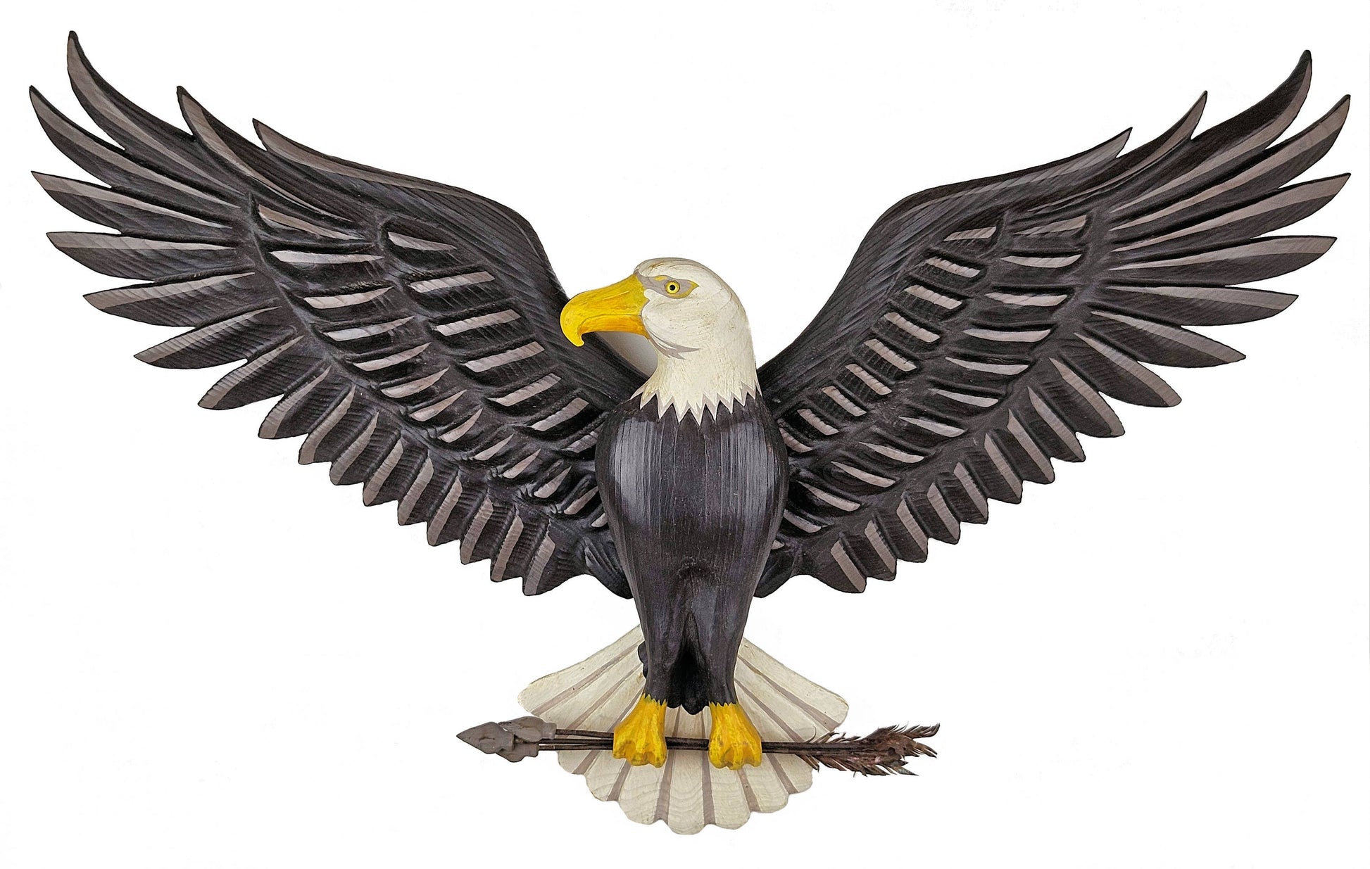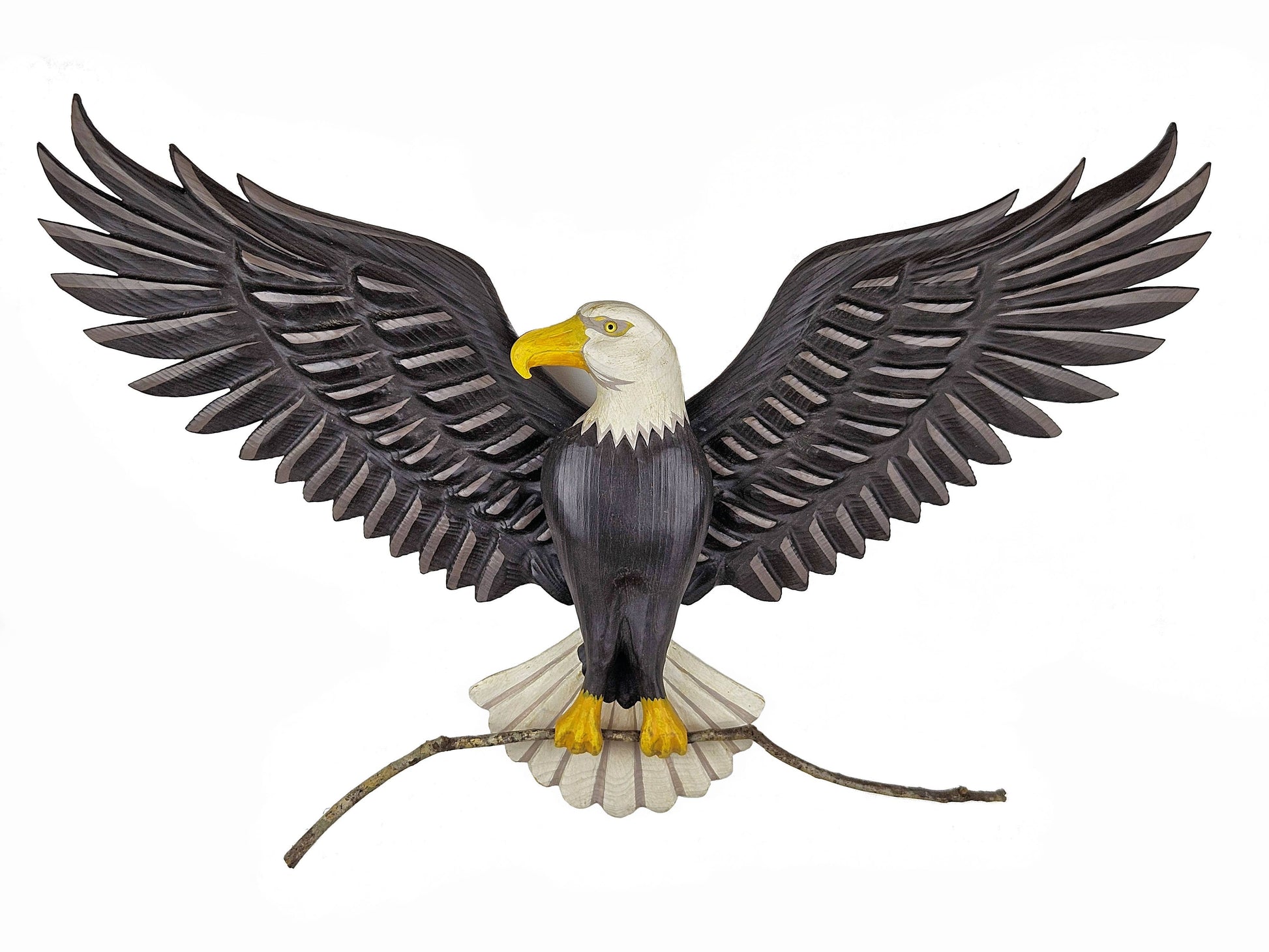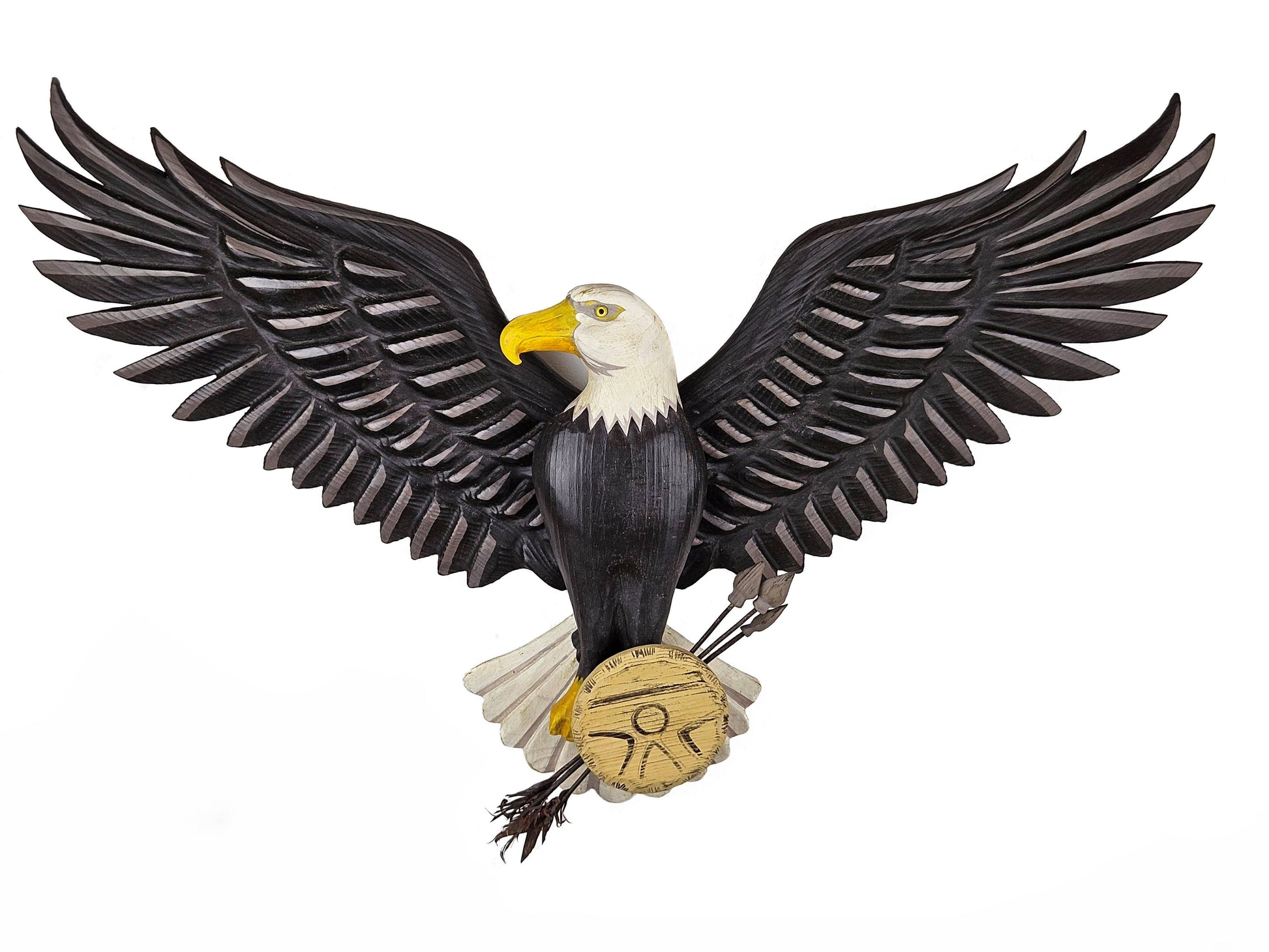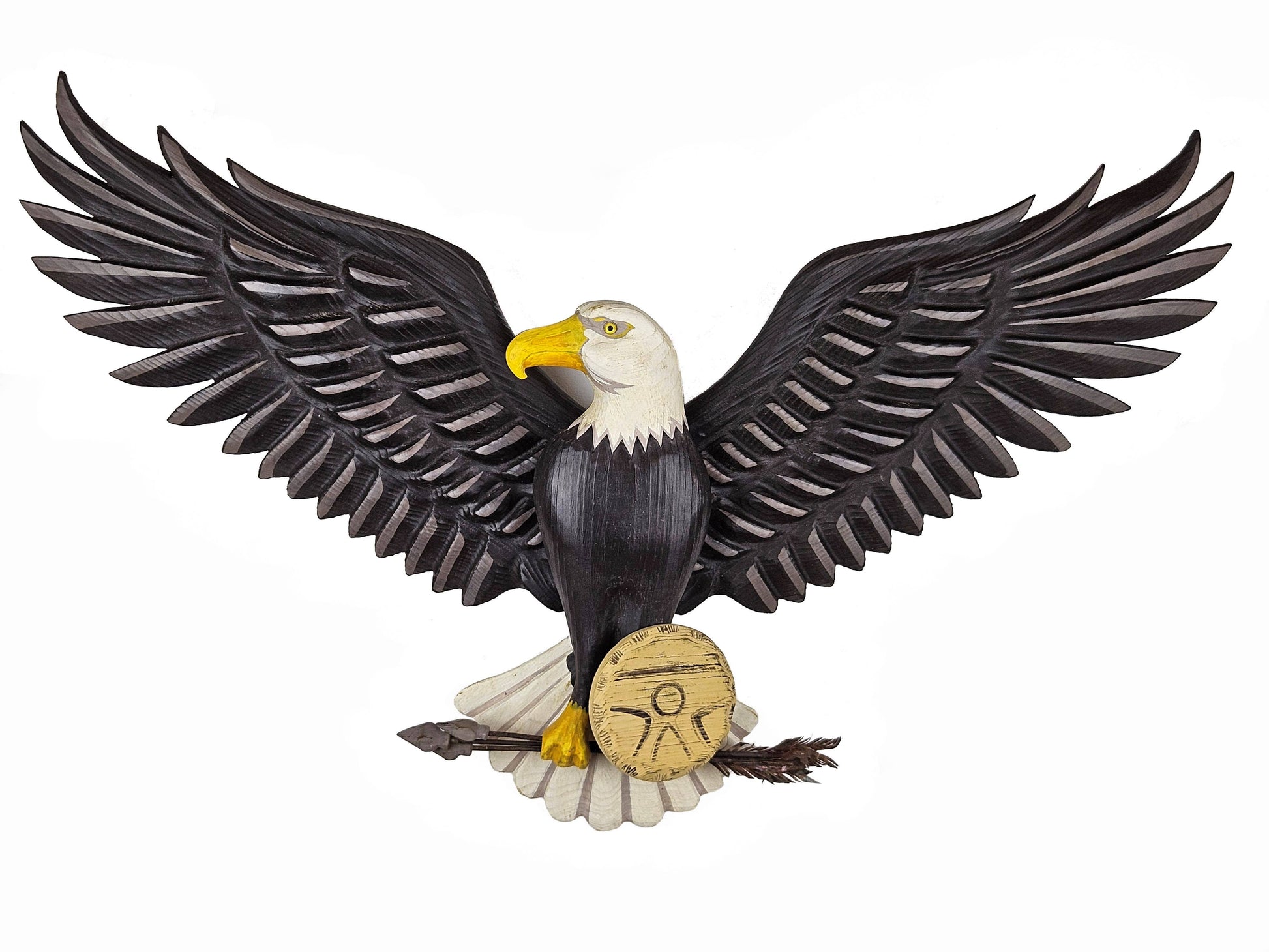This carved eagle is created using only domestic materials from the US: locally sourced, sustainably harvested cedar, custom mixed paints, salvaged copper, and crystal eyes. This wall-mounted carving hangs securely from hangers on the reverse, just like a picture frame.