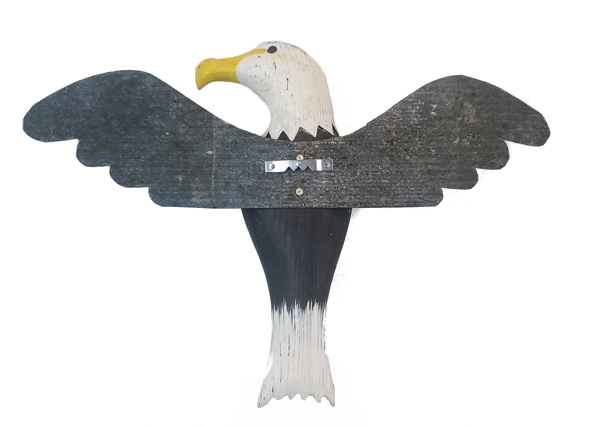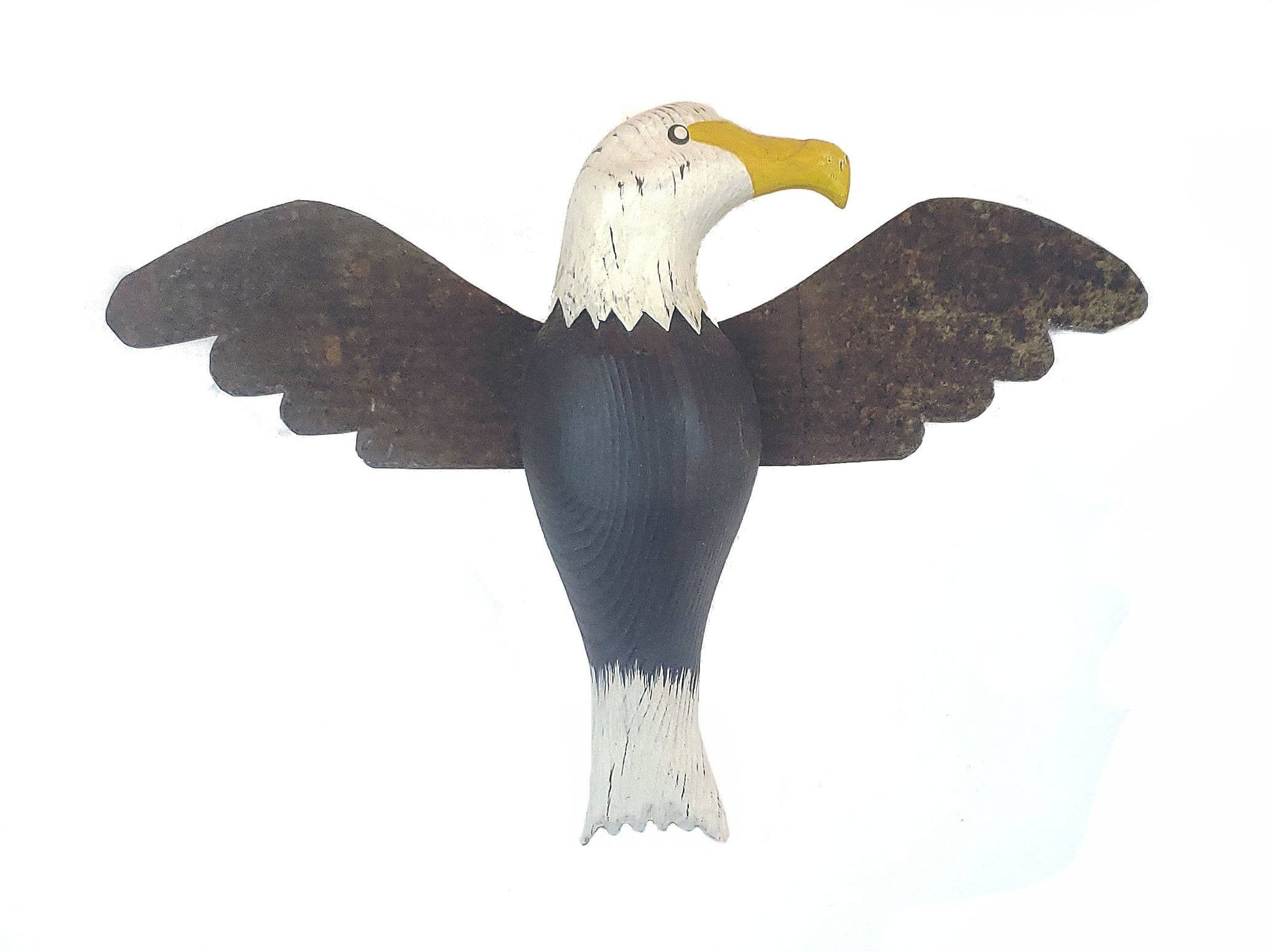 Hand carved and hand painted Eagle. Carved from sustainably harvested and locally sourced Atlantic White Cedar, with up-cycled, salvaged tin wings from their Virginia farm.