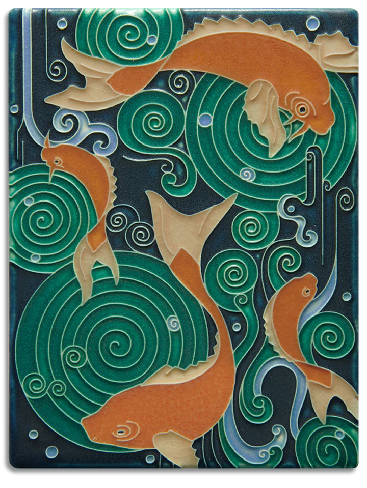 Our graceful Koi Pond tile is a scaled adaptation of a larger mural originally designed for the Grand Rapids [Michigan] Art Prize competition. The response to the mural was so overwhelming that Nawal Motawi decided to create a smaller tile for production.