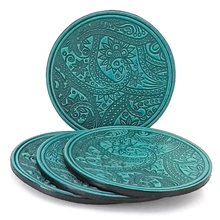 Set of 4 genuine leather drink coasters with a stunning Paisley design embossed on premium domestic leather, drum dyed for rich color and durability. Featuring black leather backing. These coasters will stand up to hard use and liquids. Protect your surfaces with American handmade style.