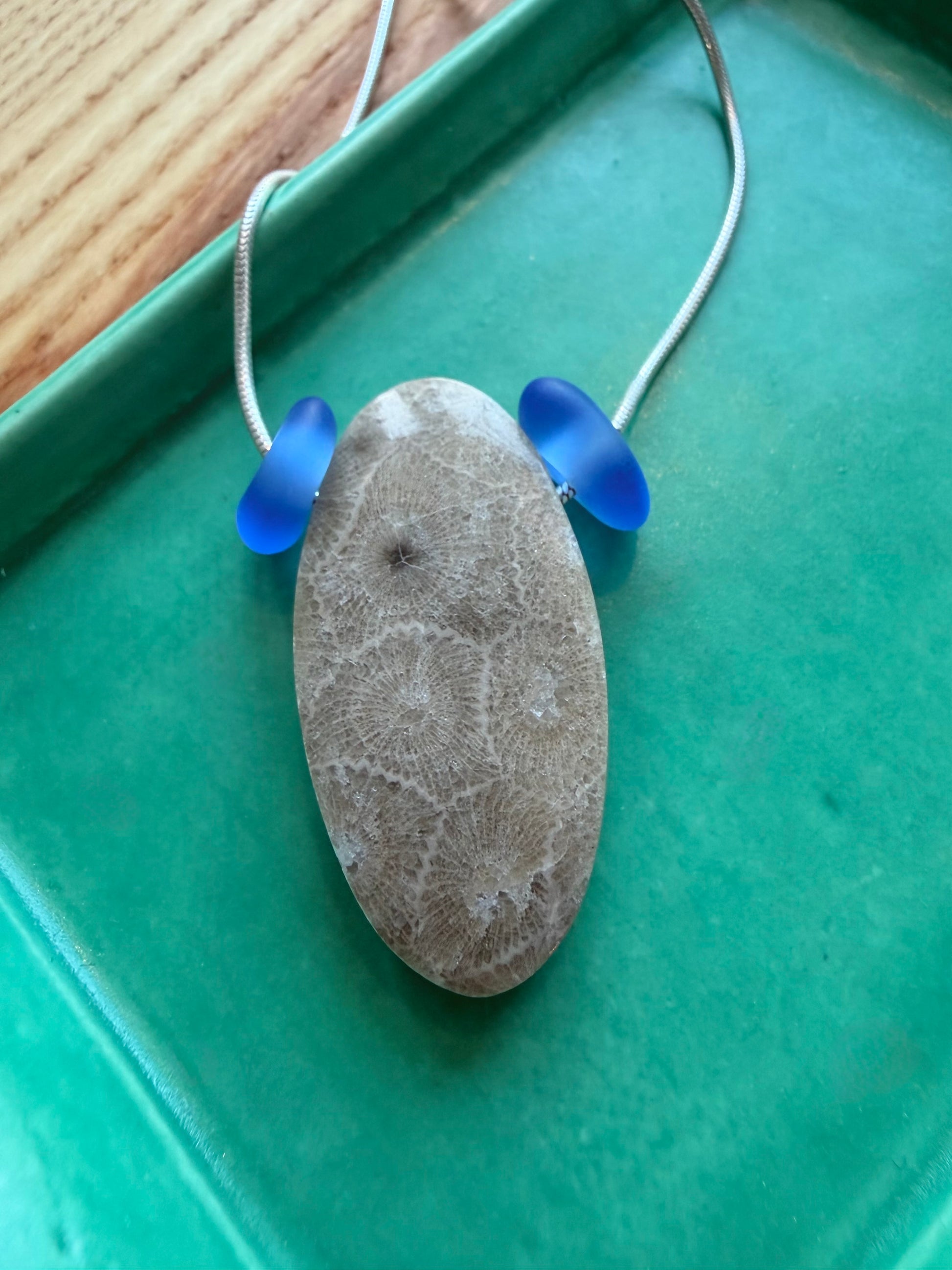Petoskey Stone Pendant with Beach Glass Beading on Silver Chain