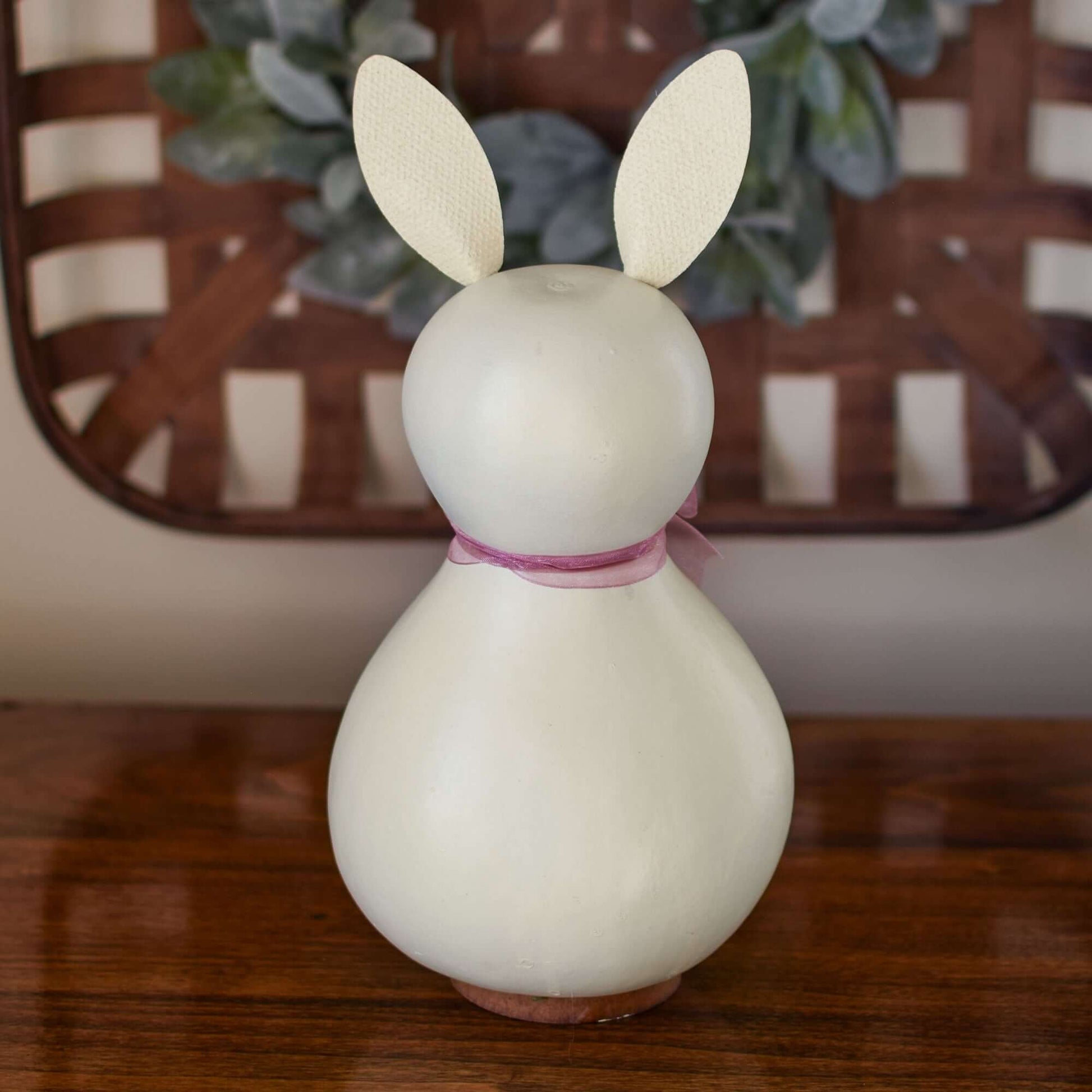 Poppy is our adorable white-colored bunny that has a mauve-colored bow. Her face is sure to make your smile. This candy dish comes with green grass and is perfect to fill with Easter candy or decorations. Approximately 6" in diameter and 12" tall.