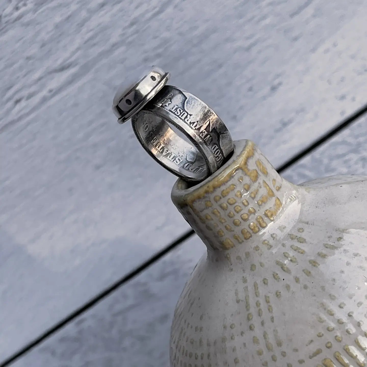 Barber Quarter (90% silver) used for sizes 5-9. Dimension varies based on coin and stone size.