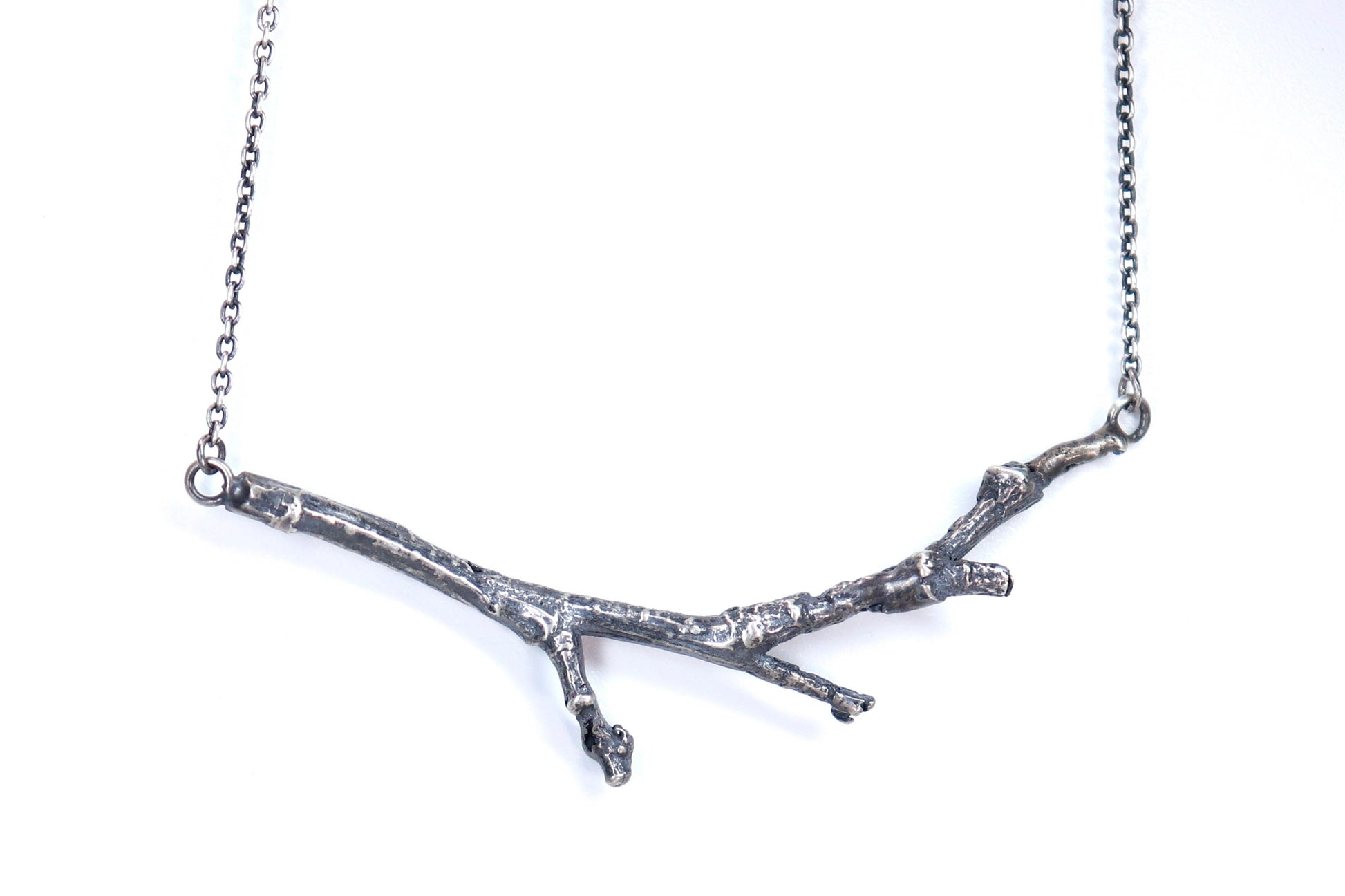 A simple twig, or branch, bar-style necklace with the texture and dimension of a real twig. Made from actual Chinese chestnut twig. Cast from the actual plant in solid recycled metal preserving the unique nature of each plant to make truly true-to-nature jewelry.